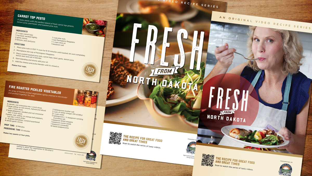While at Level, I art directed Fresh From North Dakota, a campaign for the North Dakota Department of Agriculture that features local chefs and highlights the state’s specialty crops through a series of broadcast-quality recipe videos for digital and social platforms, supported by recipe cards and print collateral. The work received a 2025 Telly Award (Silver).